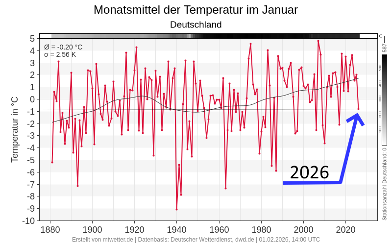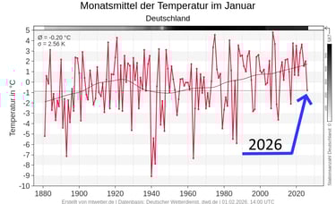 Diese Grafik (von mtwetter.de) zeigt den deutschlandweiten Temperaturdurchschnitt für den Januar seit 1880. Man sieht, dass 2026 oder 2017 gar nicht zu den eisigsten Januaren gehören. Da gab es zum Beispiel den Januar 2010 mit -3,6 °C oder 1987 mit -5,9 °C. Der kälteste Januar seit Beginn der Wetteraufzeichnungen war 1940 mit -9,1 °C – heutzutage kaum vorstellbar.