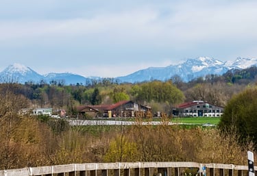 Dieses Foto wurde in Maisach aufgenommen (auf der Straßenbrücke zwischen Gernlinden und Maisach). Auf der linken Seite des Fotos ist das Flachgebäude der Dekra erkennbar, während sich etwas weiter rechts das Gebäude vom „Hatzlhof“ in Esting befindet. Die Alpen scheinen dabei zum Greifen nah zu sein.