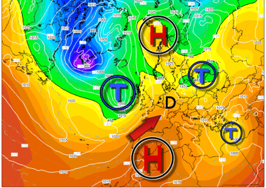 Wie ich bereits im letzten Beitrag erwähnt habe, befinden wir uns aktuell in einer sogenannten „Dümpellage“. Auch auf dieser Karte erkennt man gut, wie die Tiefs und Hochs über Europa „herumwuseln“ und wir liegen genau mittendrin.