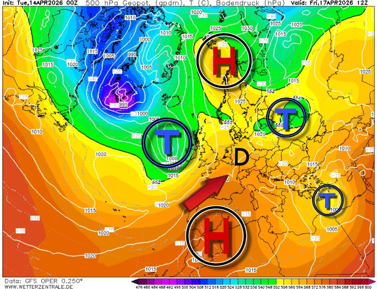 Über Europa herrscht weiterhin ein komplexes Druckgebilde. Allerdings schiebt sich in den kommenden Tagen ein Hochkeil über Mitteleuropa, sodass wir kurzzeitig frühlingshafte Temperaturen erwarten können. Dennoch bleibt eine leichte Instabilität in der Höhe bestehen. Ab Sonntag führt eine Kaltfront zu einem Temperaturrückgang. Hier mehr: