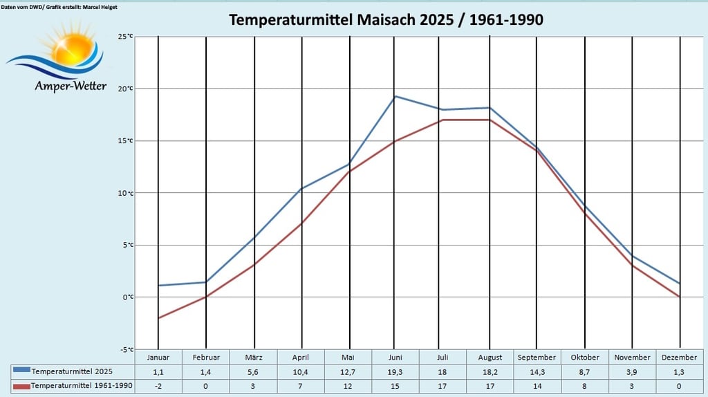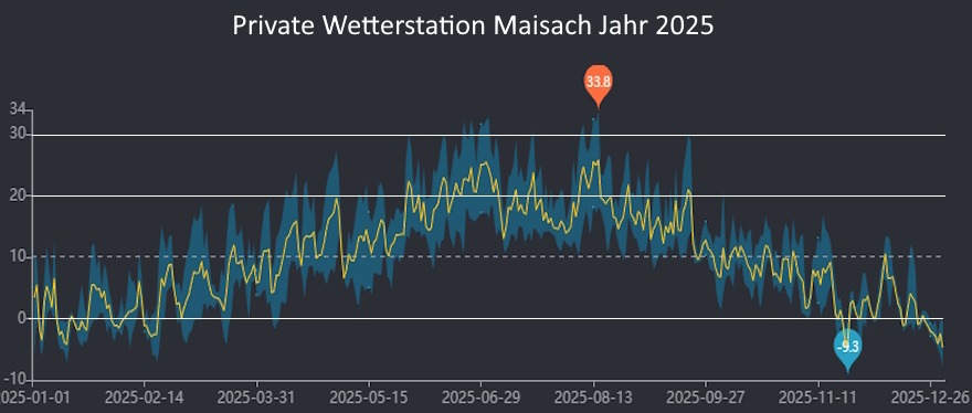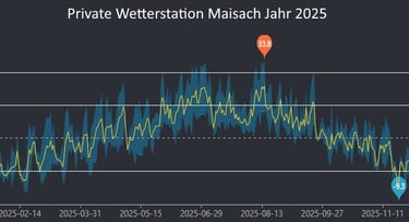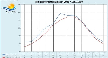 Im Jahr 2025 lagen die Durchschnittstemperaturen in Bayern häufig über dem langjährigen Mittel. Die flächendeckende Mitteltemperatur für Bayern belief sich auf +9,4 °C. An meiner privaten Wetterstation in Maisach wurde ein Temperaturdurchschnitt von +10,1 °C erfasst (2024: +11°C).