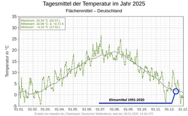 Die erste Grafik veranschaulicht die durchschnittliche tägliche Mitteltemperatur für Deutschland im Jahr 2025. Die Linie, die häufig unterhalb des aktuellen Durchschnitts liegt, repräsentiert das Klimamittel der Jahre 1991-2020.