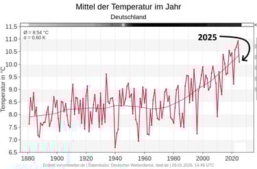 Auch wenn im Jahr 2025 kein neuer Jahresrekord verzeichnet wurde, zeigen diese Werte einen klaren Trend: Die Durchschnittstemperaturen steigen von Jahr zu Jahr kontinuierlich an.