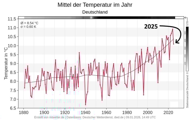 Im Jahr 2025 wurden in Deutschland erneut punktuell Wetterrekorde verzeichnet, insbesondere hinsichtlich der Temperaturen. Der bundesweite Durchschnittswert für die Jahrestemperatur belief sich auf +10,1°C. Es ist festzuhalten, dass in diesem Jahr kein neuer Temperaturrekord aufgestellt wurde. Der letzte Temperaturrekord datiert aus dem Jahr 2024 mit einem Wert von +10,9°C.