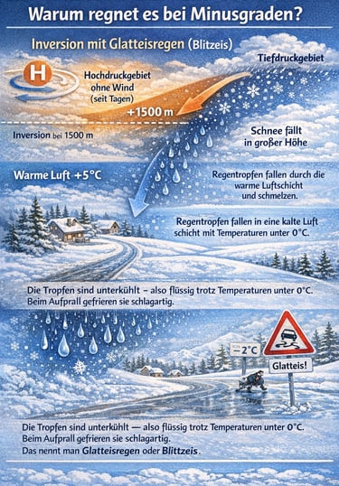 Dass es bei Temperaturen unter 0 °C regnet, kommt häufiger vor und hängt meist mit einer Inversion zusammen.