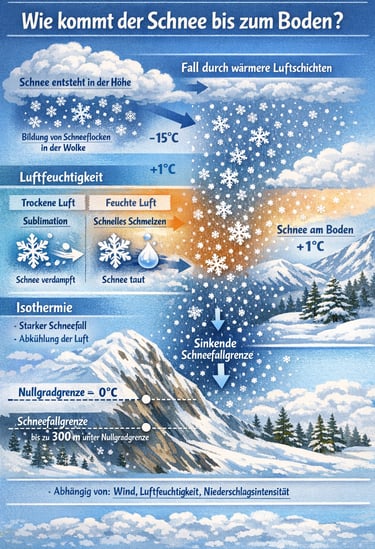 Die Schneefallgrenze liegt meist unterhalb der Nullgradgrenze, oft bis zu 300 Meter tiefer.