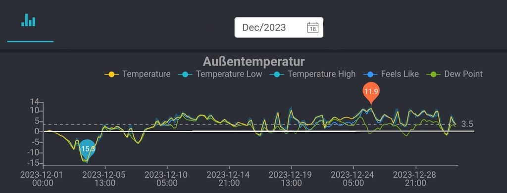 Der kälteste gemessene Wert: -15,3 °C am frühen Morgen des 04.12.2023.