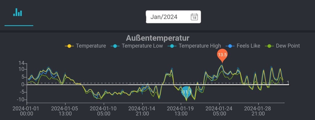 +13,5 °C am 24.01.2024 (liegen diesmal nahe beieinander)