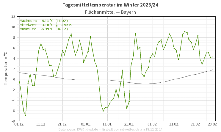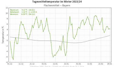 Tagesmitteltemperatur-Bayern vom Winter 2023/24 (Es überwiegte Überdurchschnittliche werte)