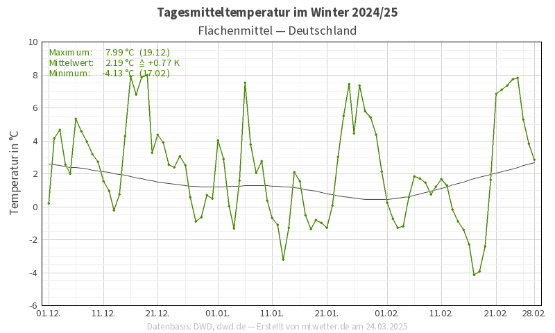 Einmal: Verlauf des Durchschnittlichen Tagesmitteltemperatur vom Winter 24/25 in Bayern. Quelle: Mt.Wetter.de mit den Daten vom DWD